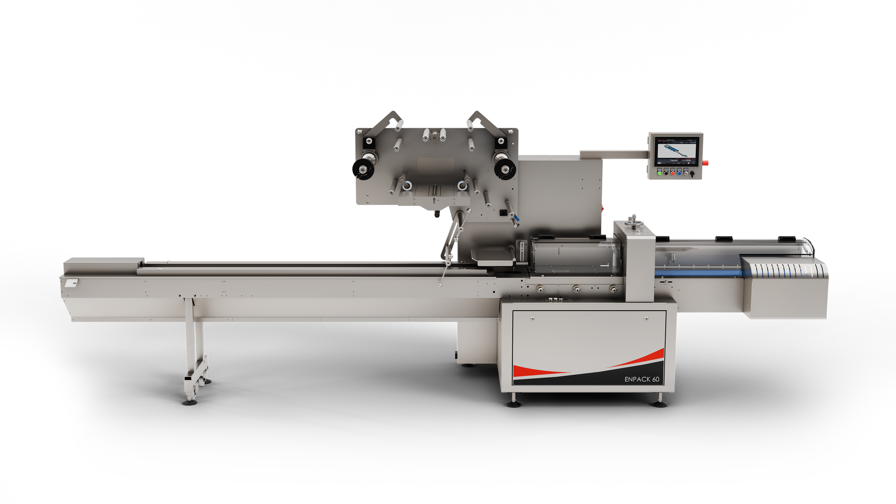 The Pack-200 is a high-performance, fully servo-driven horizontal flow wrapper for heat- and cold-sealable films. Its robust infeed, advanced film control and heated fin seal rollers ensure minimal scrap and consistent quality. The machine is fully programmable for up to 24 products, it offers smart safety features and optional upgrades such as multiple reels, automatic infeed, pneumatic ejection and date coding, perfect for boosting productivity and packaging flexibility.